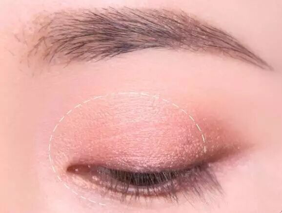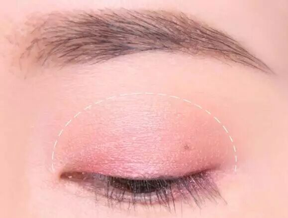 STEP1:将粉色的眼影涂抹于上眼皮的白色虚线内,给整个眼妆定下粉嫩的基调。