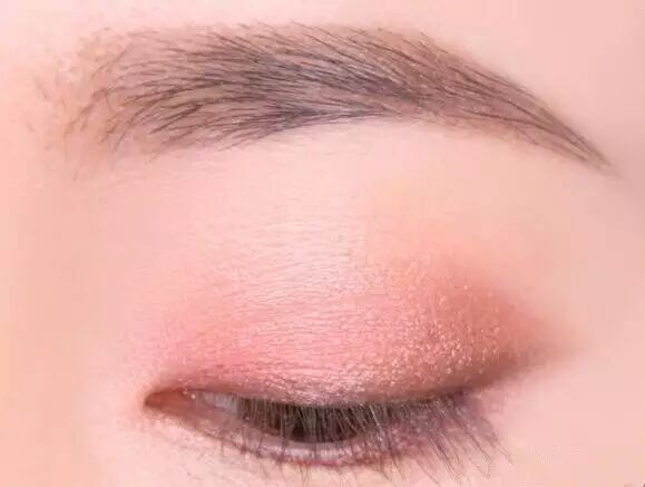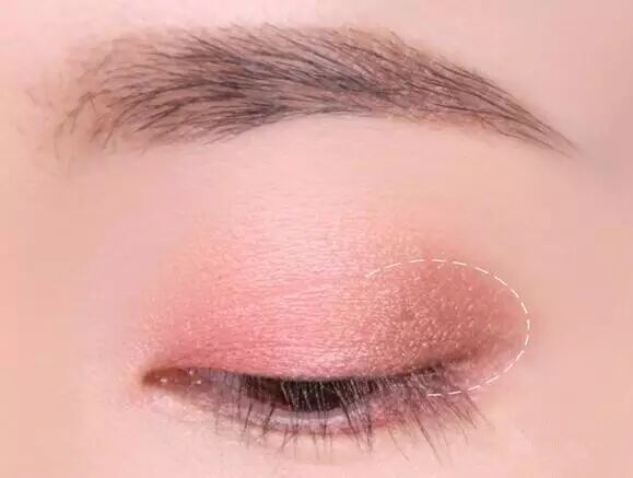 STEP2:单纯的粉色打底太过单薄,将更深一号的粉色涂抹于双眼皮及其上方2m的范围内,让眼影更有层次感。